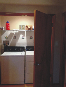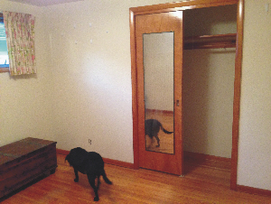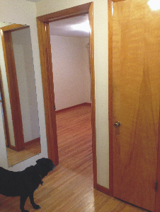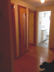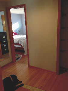 ![]() Webster investigating the pocket door opening to the master bedroom | ![]() View of bathroom from bedroom. | ![]() View of bedroom from bathroom. |