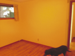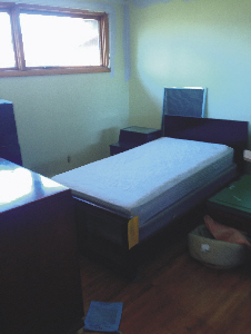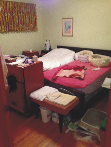 ![]() Door to left (master bedroom) will become a pocket door. Closet in middle goes away. Door to corner bedroom (new master bath and walk-in closet) becomes a vestibule bookcase. | ![]() Looking into current and future master bedroom. Not sure yet re: window treatments. | ![]() Temporary sleeping quarters (Mittens and Scooby are with Denise during demolition) |