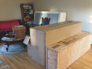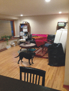 ![]() Living room clear of the vanity base and counter boxes, which arrived June 23rd. Not sure how much staging will continue here during painting. |
