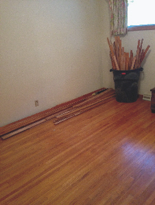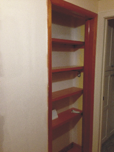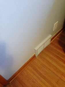 ![]() New bookcase. Shelves re-purposed from old close bypass doors. Exceeds my expectations! | ![]() Shoe molding on with "orange shellac" | ![]() floor grate in; new diffusers also being installed |