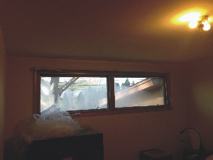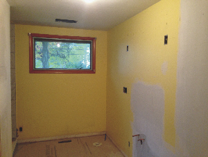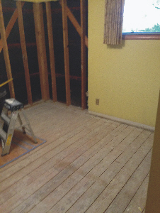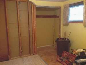 ![]() View in current and future master bedroom. Wall to left will be knocked out to extend bedroom and will abut walk-in closet. Wall to right will contain double pocket door to master bath. | ![]() View from where the shower will be in back corner of the house. Door opening to left will become an outward facing bookcase. | ![]() Toilet and vanity will go against the wall with the outlet. Heated towel bar will go under the window. |