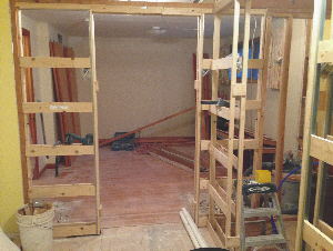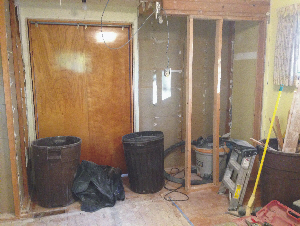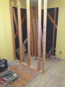![]() Shower is framed; drain is roughed in. | ![]() Toilet and vanity openings roughed in. | ![]() Back of master bedroom old closet has been removed (looking at interior of doors on the left). Closet side is framed (right). |
