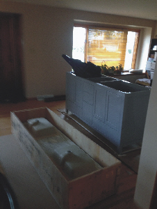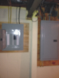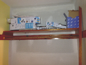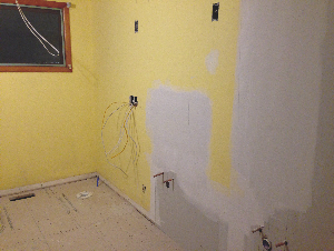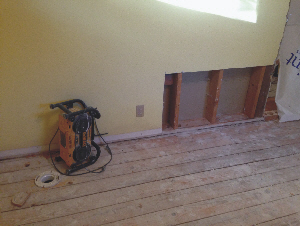 ![]() Brian stitched in the floor; took 4 hours. Had to take up all the flooring the area because the boards weren't aligned. | ![]() Randy finished wiring, including for heat lamp and fan. Inspection on Friday. | ![]() The former light switch to the back bedroom is now an outlet in the new bookcase, which will come in handy |