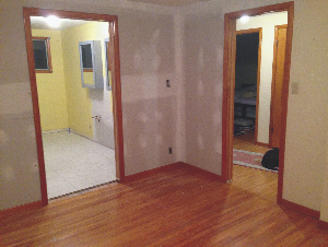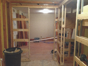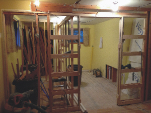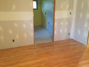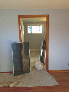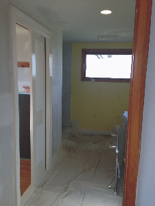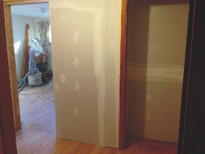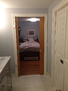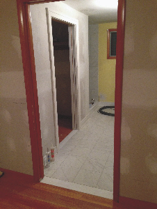 ![]() Looking into Master Bedroom from bathroom through pocket door opening. Framed closet on right. | ![]() Looking into bathroom from Master Bedroom through pocket door opening. Framed closet on left. |
