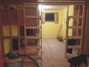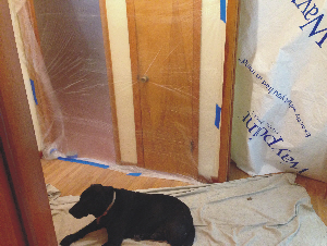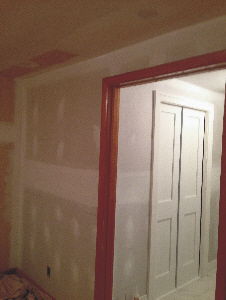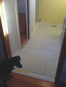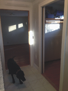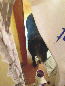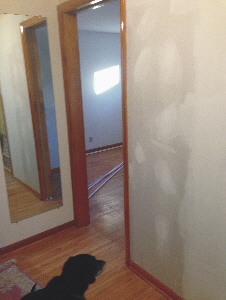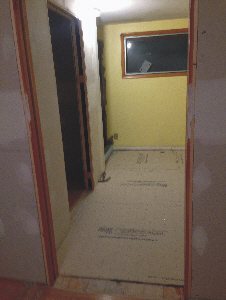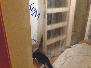 ![]() Puppy inspecting plumbing rough. | ![]() River guarding vestibule before little hall closet goes away |