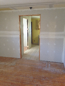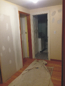 ![]() View from guest bedroom of vestibule. Left is opening for bedroom pocket door. Middle is former hall closet now drywalled over. Right is former door to corner bedroom, now future bookcase. | ![]() View into bathroom from bedroom. Can see old master closet footprint on left, old corner bedroom closet footprint in middle, and old vestibule closet footprint on right. | ![]() View from bathroom into bedroom. Shower valve to right. Closet pocket door in middle. Opening for pocket door to bedroom to the left with River. |