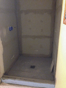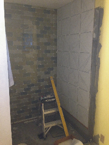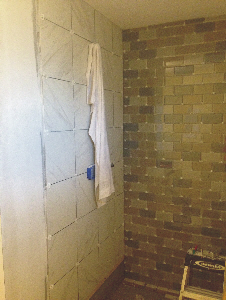 ![]() hall wall and bookcase. Patching of wall next to guest bath. | ![]() backer board on floor in anticipation of laying tile | ![]() shower sill is in and valve for handheld. Insulation behind the drywall. |