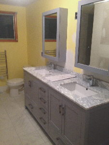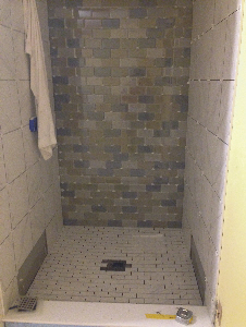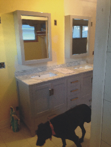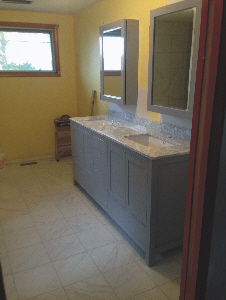 ![]() Vanity boxes opened -- no damage (exhale!) | ![]() Vanity set; needs leveling and to have the handles reversed (they were screwed inside the cabinets for shipping. 10 handles total x 2 screws each. | ![]() Shower tile is grouted |