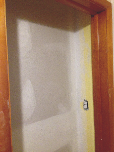 ![]() pocket door hardware. Bookshelves from repurposed doors in background | ![]() love the LED nightlight in the bathroom switches! |
