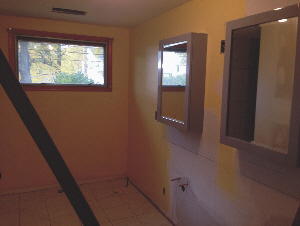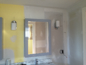 ![]() floor is mostly tiled, sill is on | ![]() determined positions for sconces and outlets. Due to size of medicine cabinets, we'll only be able to use 3 sconces, not 4 | ![]() recess lighting in closet, and track for pocket door |