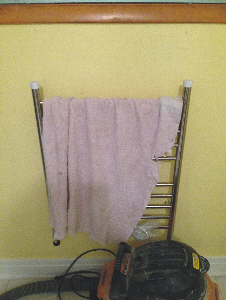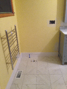 ![]() "Hollywood Sills" are in between bathroom and bedroom, and bathroom and closet | ![]() heated towel bar hung. Need to take it down for the painter? | ![]() bifold doors to closet hung. They are pre-primed and will be painted |