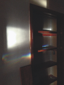 ![]() rainbows on the bookshelves from the dining room beveled mirror reflections! |