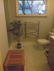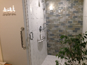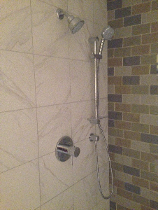 ![]() see faucets and toilet (from old lav) installed. Plenty of room on either side of the vanity for cat boxes! | ![]() plumber installed the Groehe showerhead and handheld, and Loren installed the bar. Need to finalize placement of grab bars. |