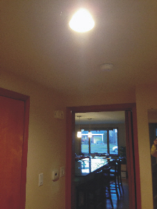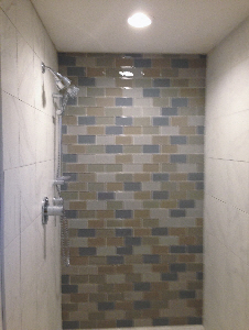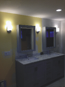![]() Decisions, decisions: sconces opening up or down? We thought it would be down, but upon actually seeing how they looked: | ![]() Decision was opening up! | ![]() Overhead light in shower. |