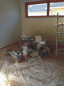 ![]() master bedroom doubling as supply storage area | ![]() looks like he'll paint the pocket doors in-situ instead of taking them to his shop | ![]() guest bedroom; removed draperies but will put them back up |