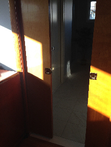 ![]() Hollywood sill between bathroom and bedroom. (Another will go between bathroom and closet). Loren needs to shim by 1/8". Also Corian sill between shower sill and tile. Note that vanity handles now turned outward; drawers and doors are self-closing. Love the design! | ![]() White trim, base, and shoe molding in. It's pre-primed, ready for the painter. Afternoon sun coming through. | ![]() Repurposed trim around bedroom pocket door. Shoe molding for bedroom awaits Monday installation. |