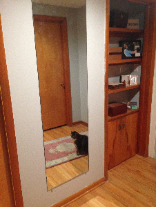 ![]() Loren installed the doors at the bottom of the bookshelf, an homage to the old kitchen. He also did me the favor of moving the mirror from perpendicular to the master bedroom door to parallel. I will put the family Christmas photos on the perpendicular wall once I paint it. I can't wait to see how the re-placed mirror will further enhance my rainbow parties! Mittens is the featured cat. | ![]() Shower grab bars. The entry bar had to be placed outside due to a combination of the handle on the shower door and the location of the pipies. One combination toiletries holder / grab bar is installed under the shower controls, and another on the wall opposite. Still not sure if the 24" grab bar will go up or be returned to Home Depot. Even putting up the Buffalo metal sculpture posted a challenge given the pocket door. Unfortunately some ceiling paint is not sticking so I need to call the painter. | ![]() Loren adjusted the stops in the closet pocket door. The view from the bathroom shows a picture from Lee now above the bed, with Webster on the pillow to the left. |